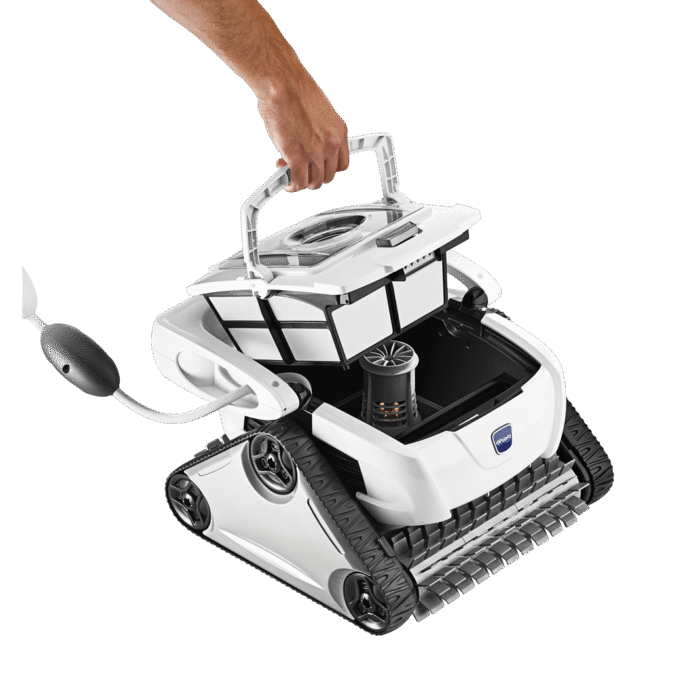 The Polaris P825 Robotic Cleaner deftly navigates all pool surfaces, climbs walls and steps, and scrubs the tile line for thorough cleaning. Proprietary Cyclonic Vacuum Technology ensures powerful cleaning action without losing suction, and the Push ‘N’ Go filter canister with transparent viewing window enables easy debris removal without ever touching debris. The P825 combines an advanced artificial intelligence system with strong suction and a filter cartridge system.